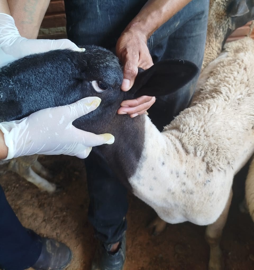 Durante a visita, os estudantes acompanharam a realização do método Famacha, que permite a individualização da vermifugação ao comparar a coloração da mucosa do olho de cada animal com os 5 graus de coloração de um cartão específico, representando os níveis de anemia que o animal pode apresentar.