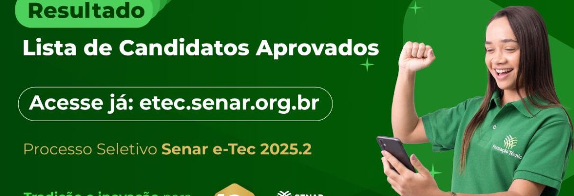 O Serviço Nacional de Aprendizagem Rural (Senar) divulgou a lista dos candidatos aprovados no processo seletivo para os cursos técnicos da rede E-Tec, referente ao segundo semestre de 2025. As vagas do Senar Piauí são para: Agropecuária (polo Teresina) e Zootecnia (polo São Raimundo Nonato). Os cursos técnicos são gratuitos, reconhecidos pelo MEC, e contam